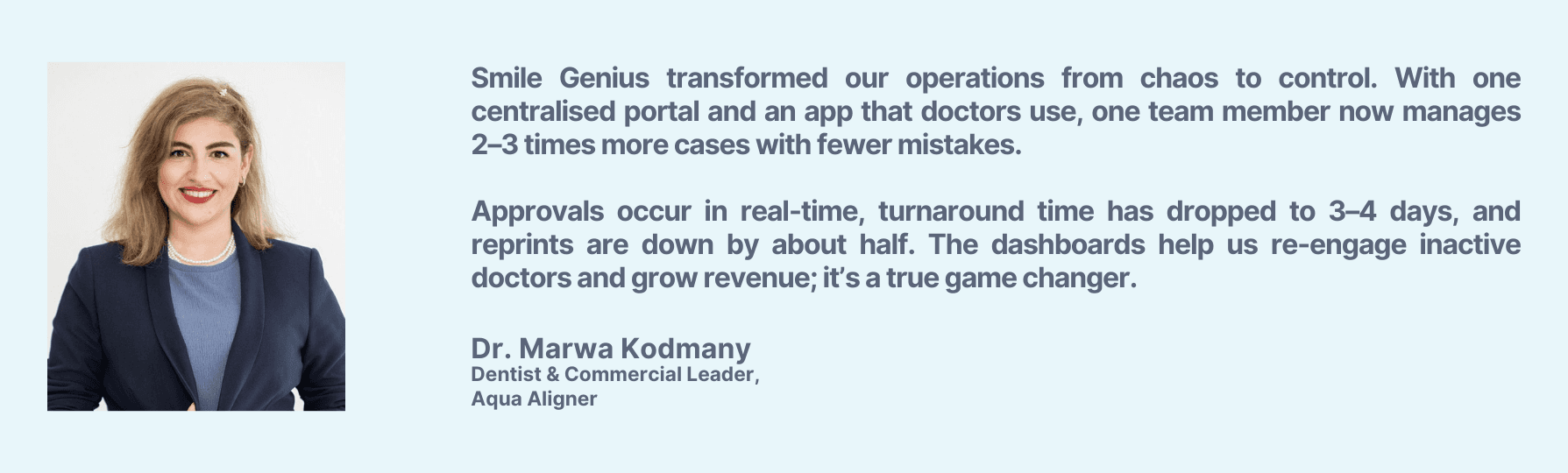 “Smile Genius made our entire workflow plug-and-play. Doctors loved how easy it was to use, no training needed. It centralised all communication, so our small team could handle more cases without burnout.”